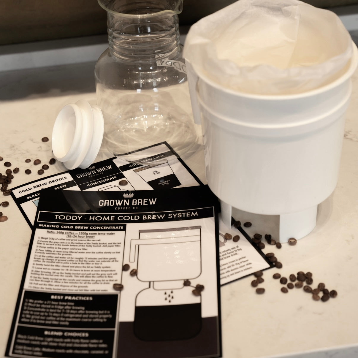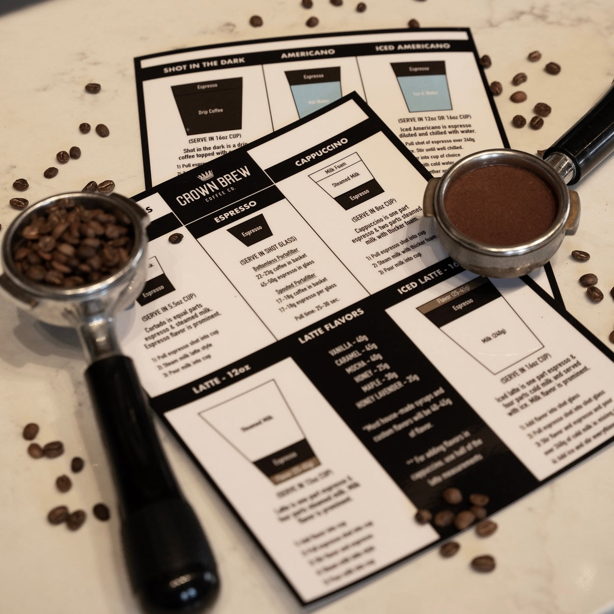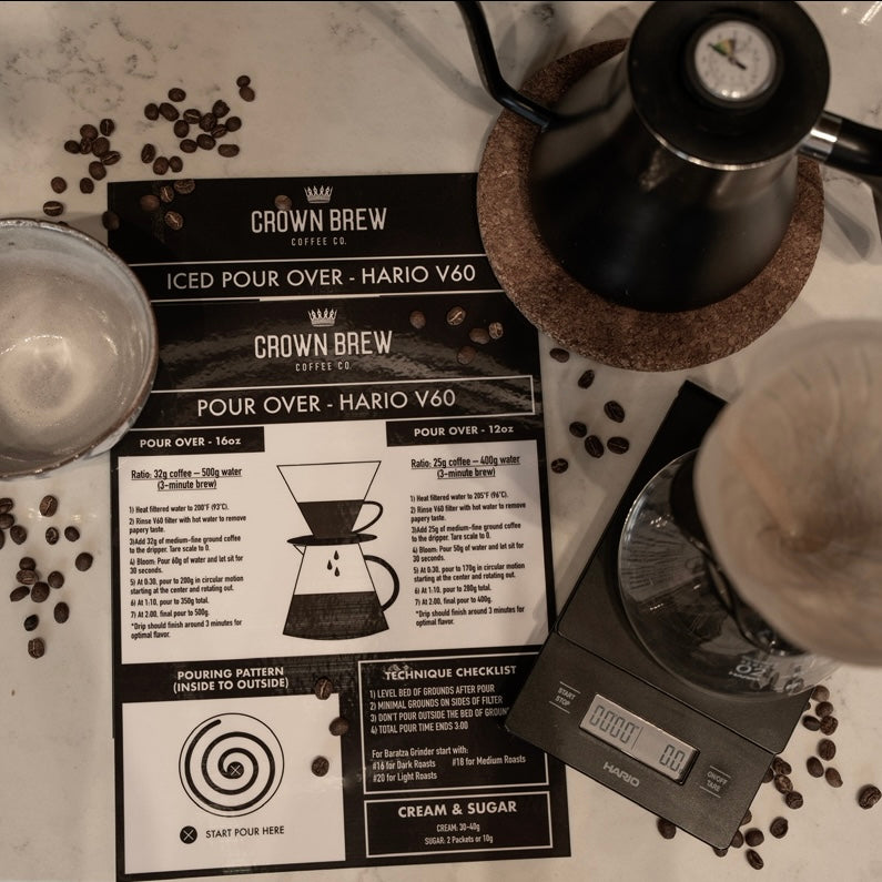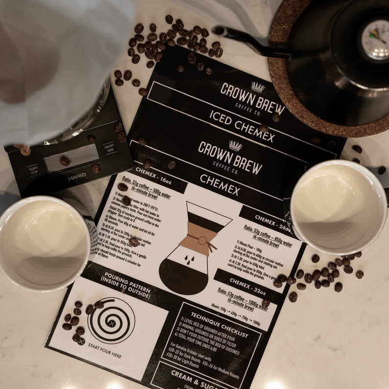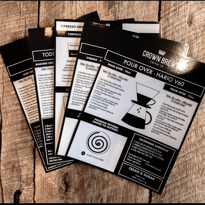 These are the exact guides we use to train our team at Crown Brew—and now they’re yours. Each 8.5x11 laminated card features our go-to brew methods on one side and an iced or specialty version on the back. Whether you're a beginner or a barista, these are the cheat sheets you’ll keep reaching for.